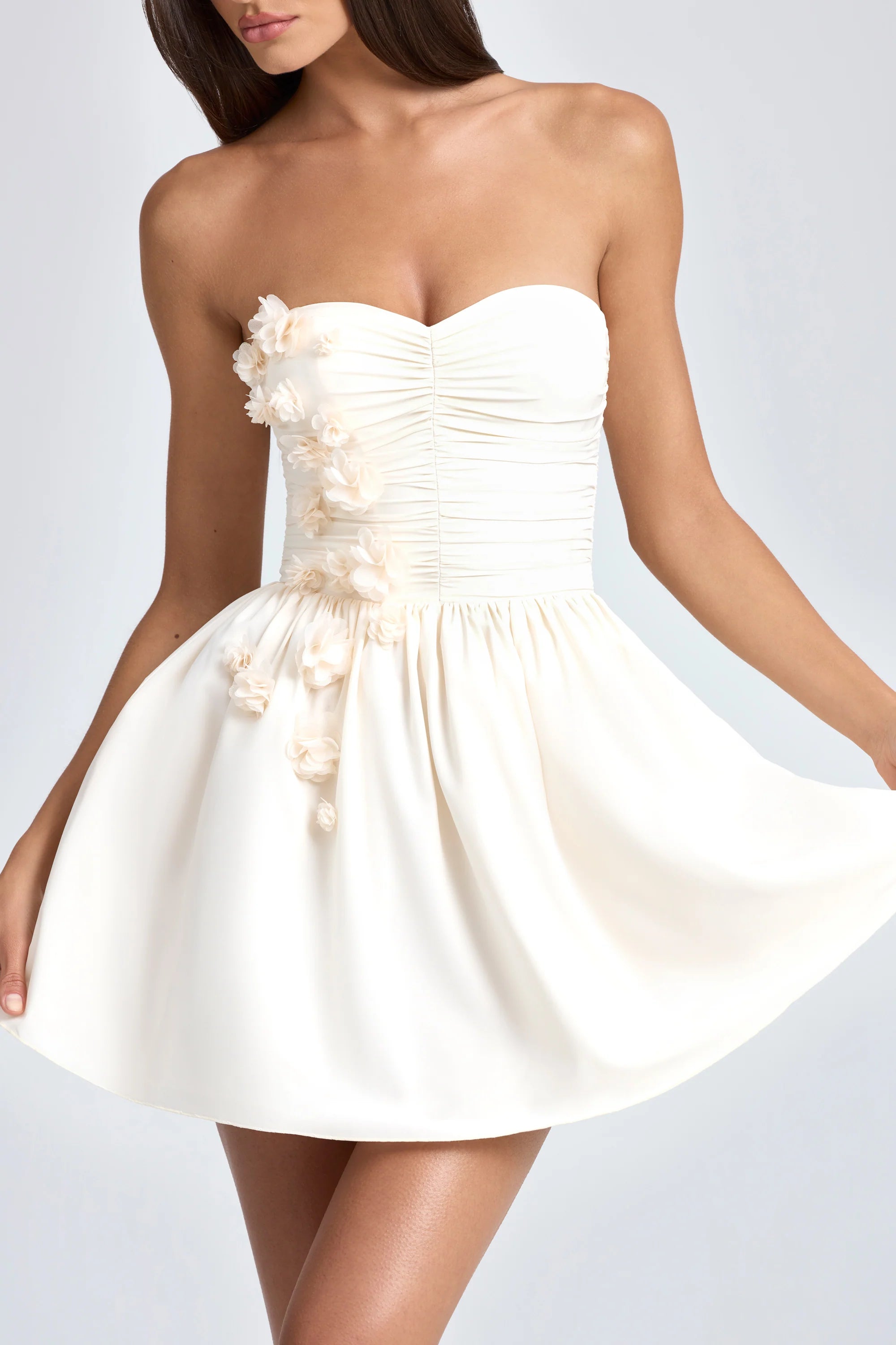 Mirroring the radiance of endless summer days, the Mirabelle dress is adorned with delicate floral appliqués, inspired by blooms found in botanical gardens. It’s crafted from stretch georgette with a voluminous mini-length skirt. The corset bodice is elevated with precise ruching and signature lace-up detailing at the back for a comfortable fit.