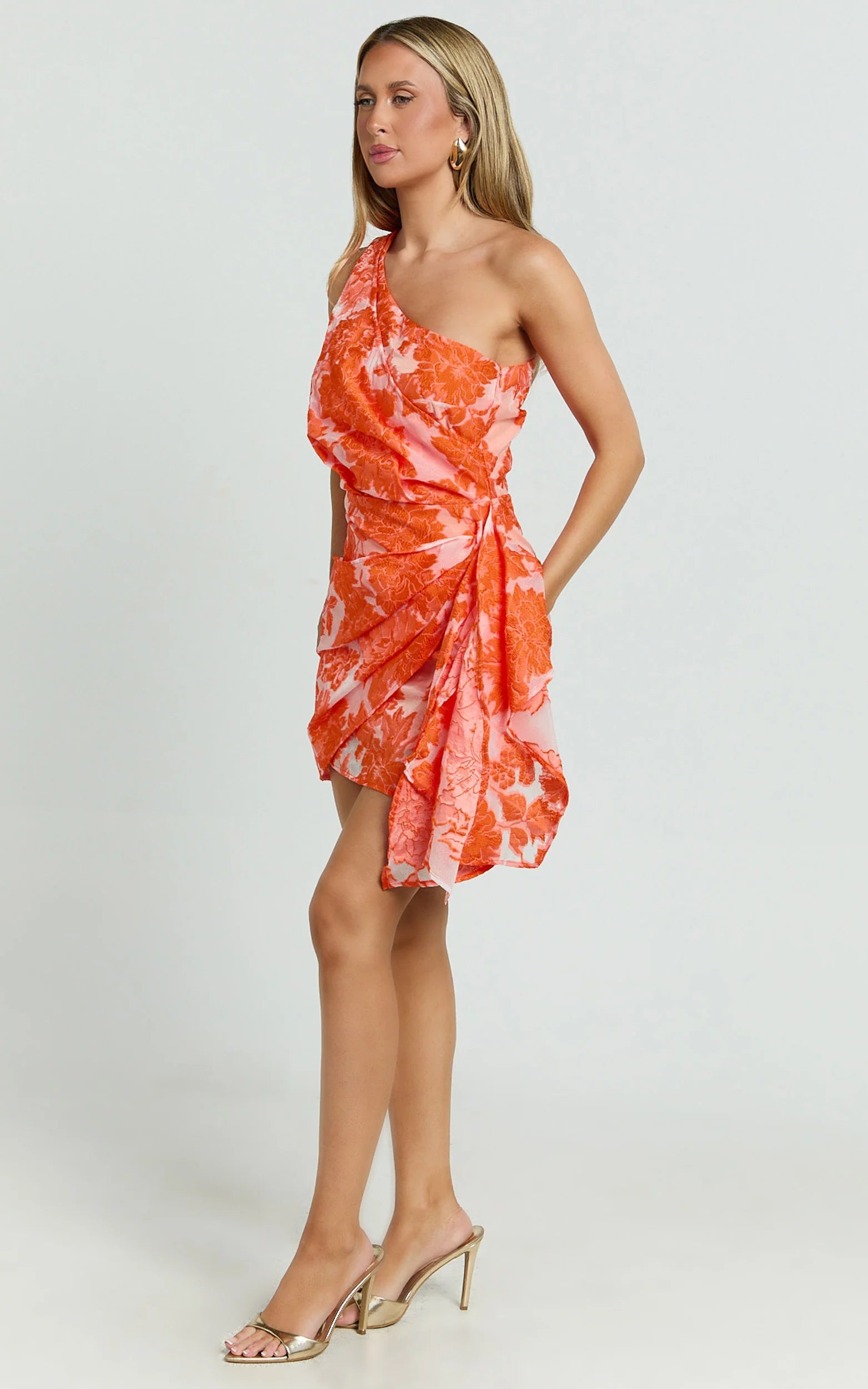 Chic, femme and in demand. Make the beautiful Brailey Dress your go-to party 'fit this season! Featuring a one-shoulder design, asymmetric neckline, draped side tie knot detail and a textured floral jacquard print, this pretty mini is perfect for those special events and occasions coming up. Team it with strappy heels, pretty hoops and a mini top handle bag for a gorgeous ensemble!