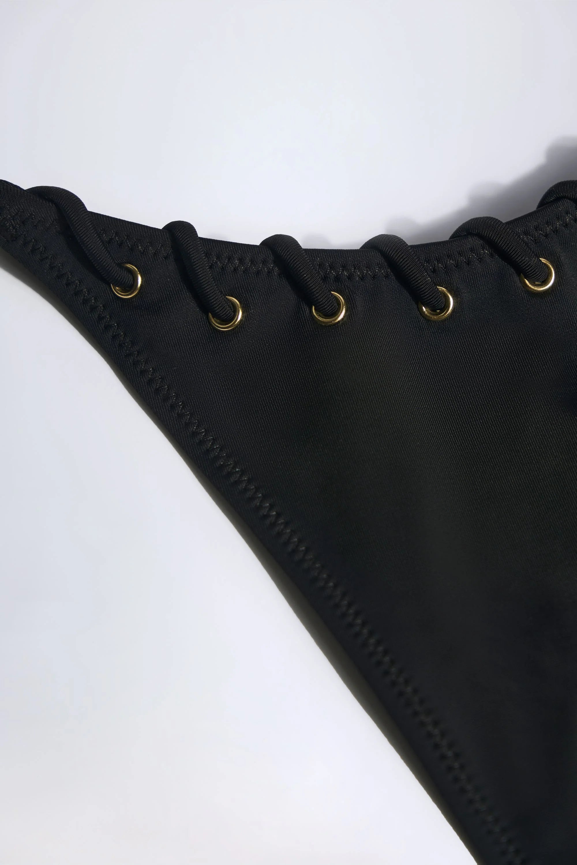 Elevated swim silhouettes. A summer must-have, the Polynesia bikini bottoms are crafted from premium stretch-jersey swim fabric to a flattering high-cut leg with slender straps for minimal tan lines. They’re elevated with eyelet hardware and lace-up detailing, and feature a functional ruched channel to allow for customisable thong coverage.