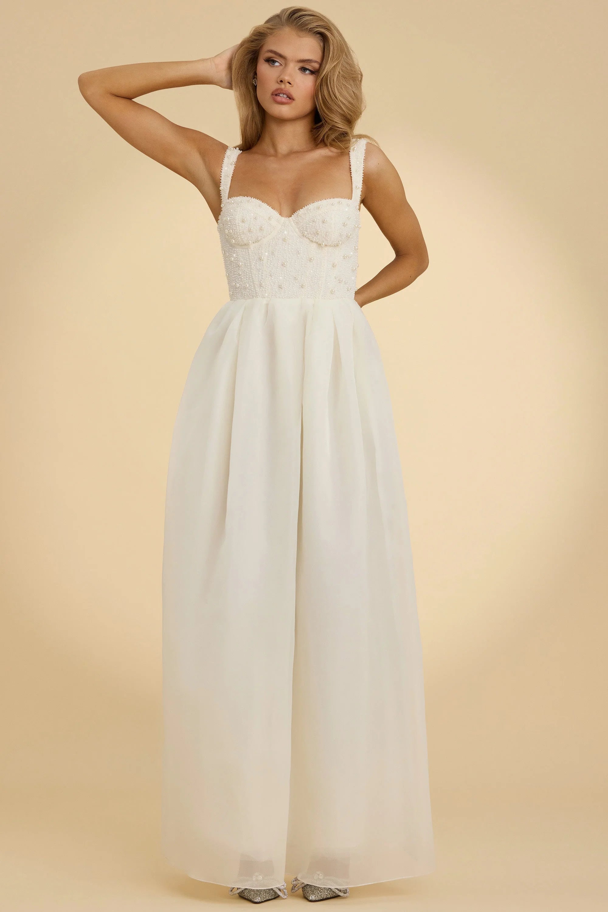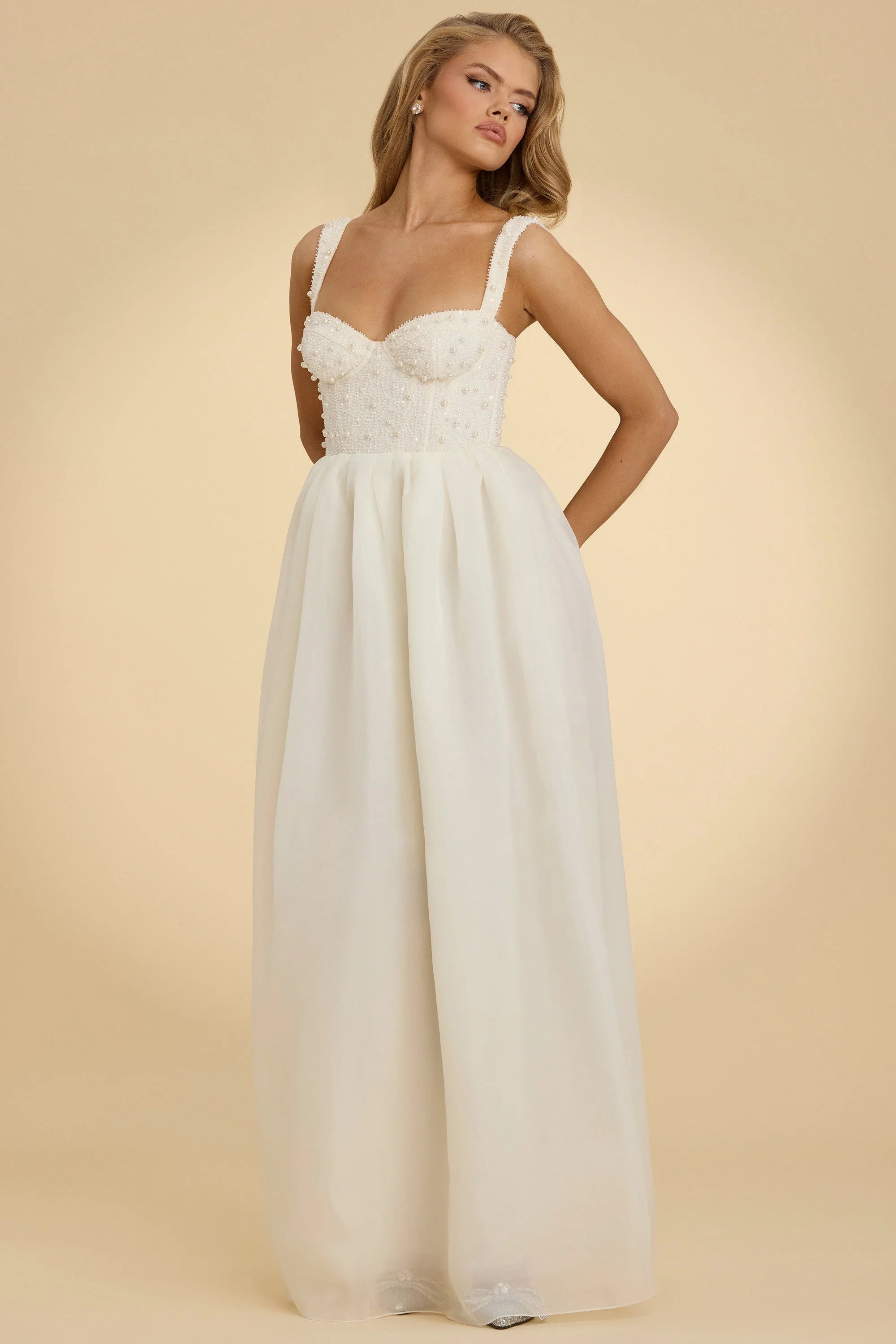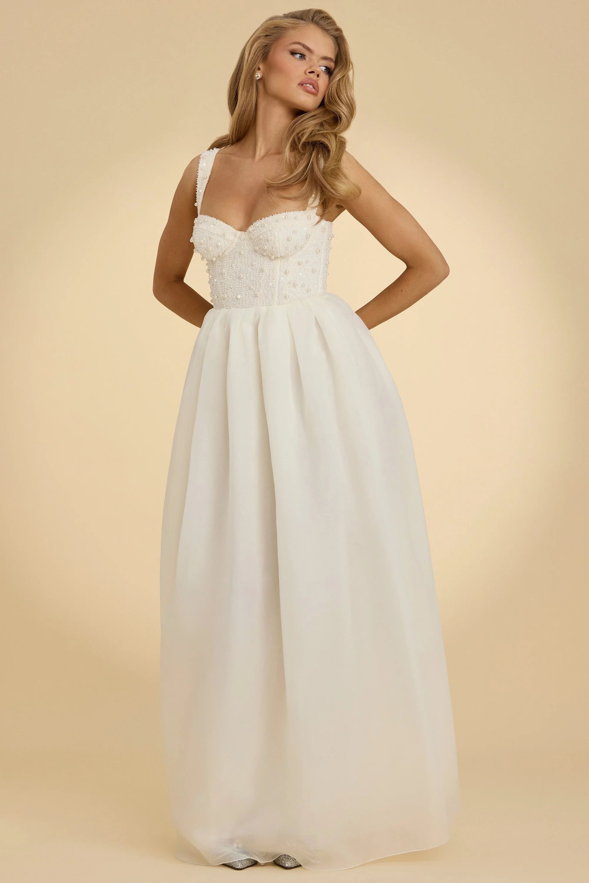 For nights you’ll never forget. Designed for your special events, the Delancey gown features a premium mesh corset for enhanced support, elevated with hand-finished bead and pearl embellishments that sparkle under spotlights. It’s cut to a dramatic maxi length with a voluminous organza skirt and is complete with adjustable tapered shoulder straps for your perfect fit.