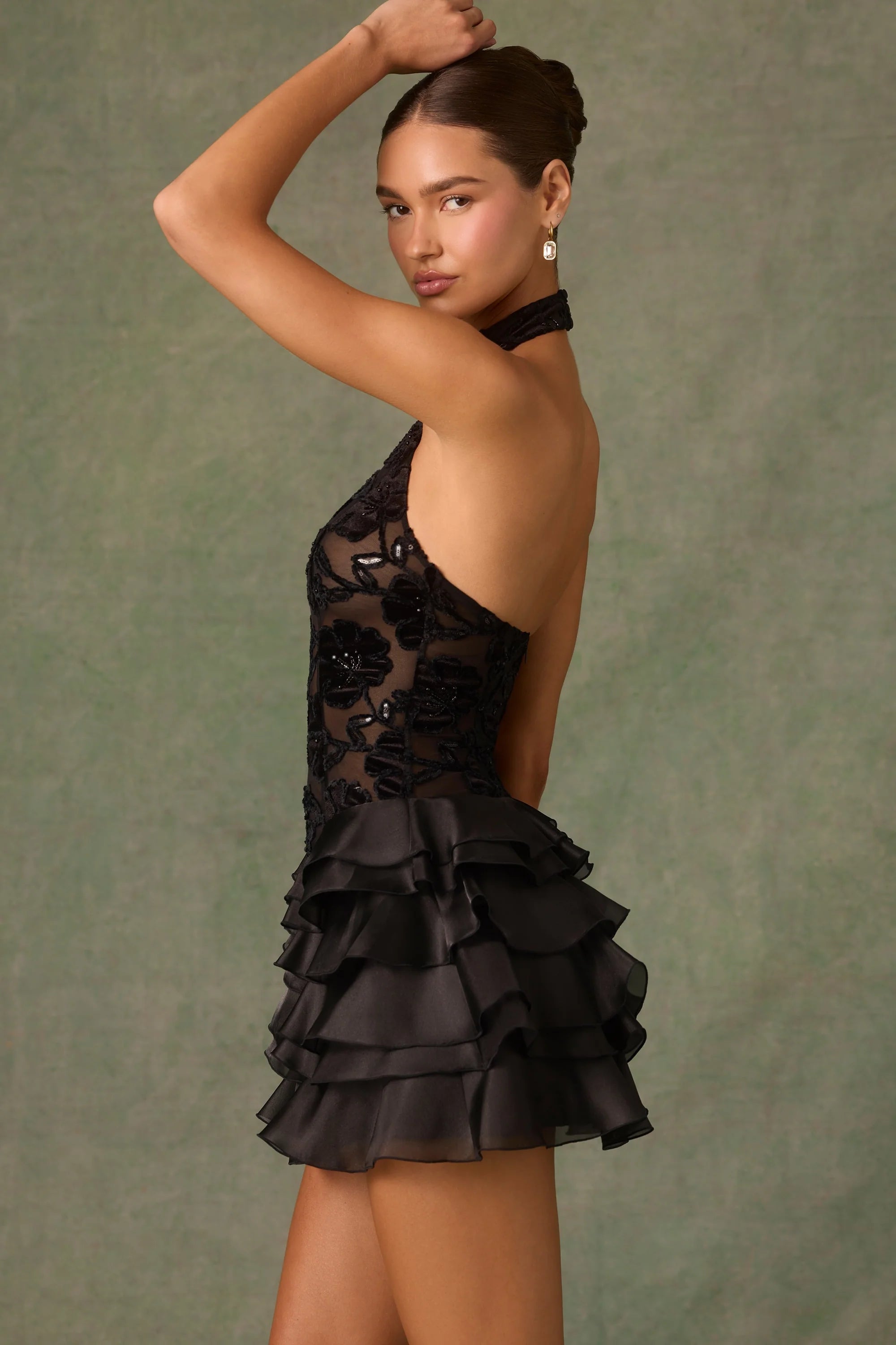 Art you can wear. Unmatched in attention to detail, the Petalia mini dress is crafted with a premium V-shaped velvet mesh bodice for enhanced shaping and adorned with flocked floral appliqués, brought to life with sparkling sequin embellishments. It’s cut to a halterneck silhouette with a statement open back and features a voluminous tiered ruffle organza mini skirt that holds its shape.