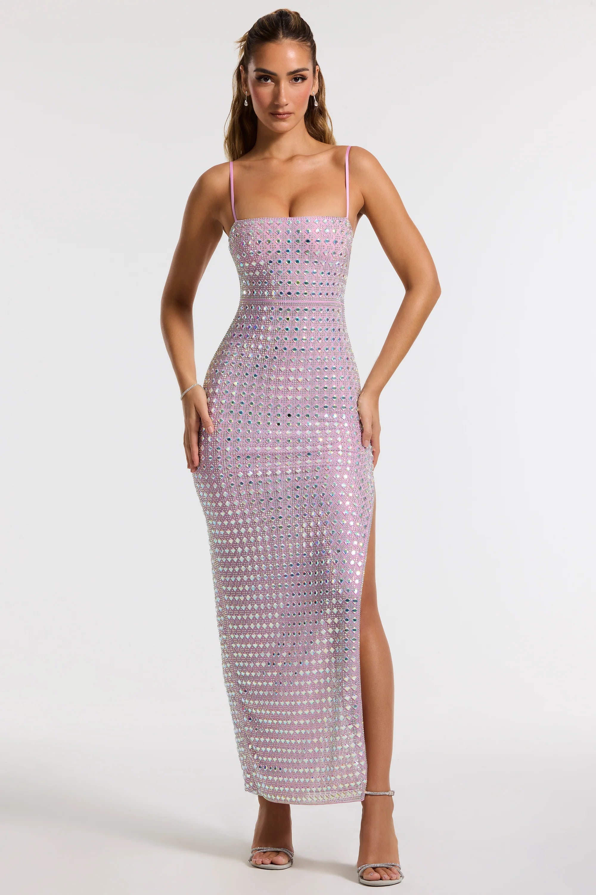 Featuring a low, open back with strappy detailing, a flattering column shape, and a thigh-high side split, our Prisha evening maxi gown was designed for elegant moments. Hand-finished with mirrored detailing, this embellished maxi dress was curated in our ultra-soft, sculpting, stretch mesh fabric for a close yet comfortable fit.