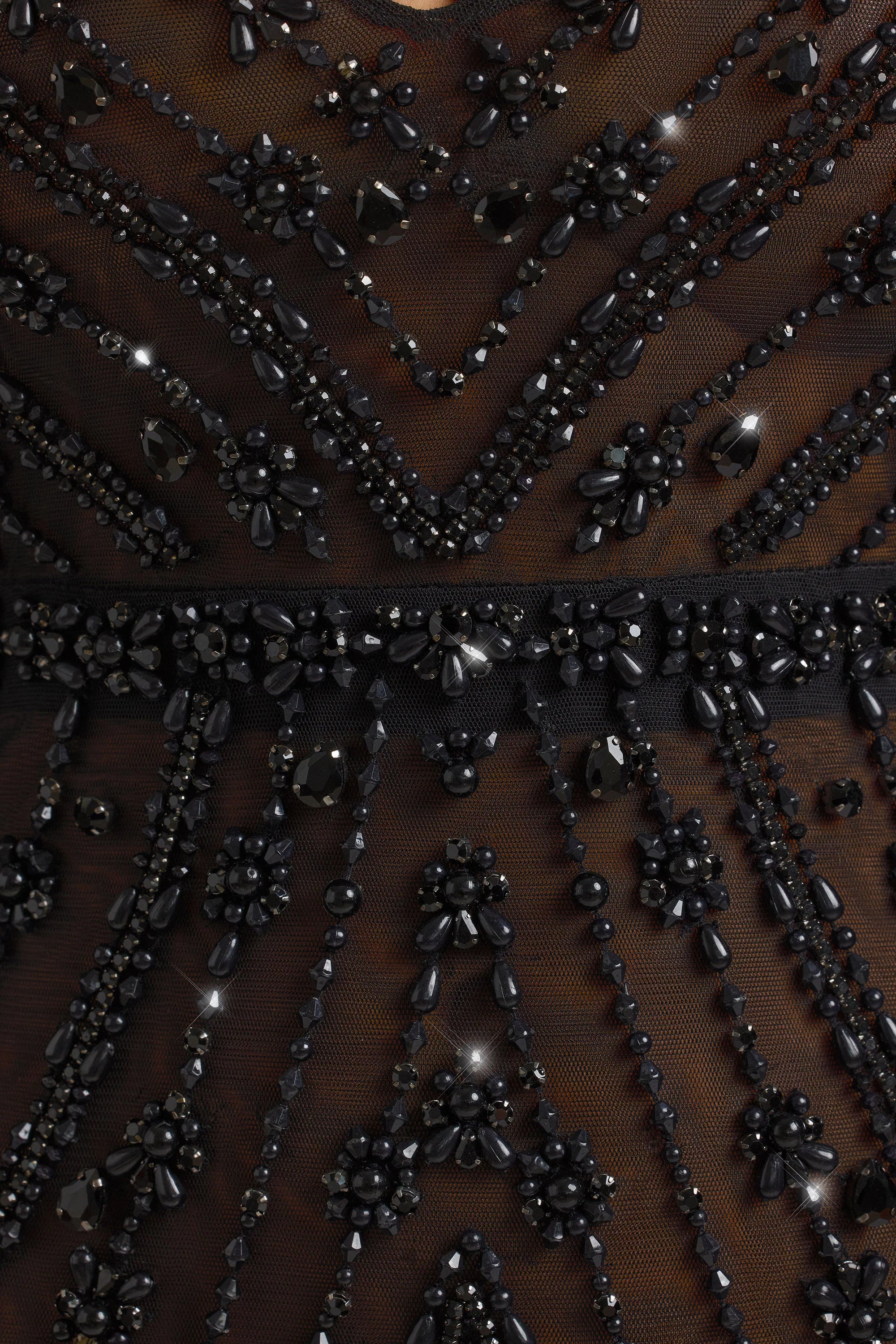 Hand-finished with pearl and rhinestone embellishments, the Giorgia evening gown embodies decadent occasion wear. Cascading to a maxi length and graduating into a train, Giorgia was designed in sheer mesh and features a V-shaped neckline with a low back and delicate strappy detailing.