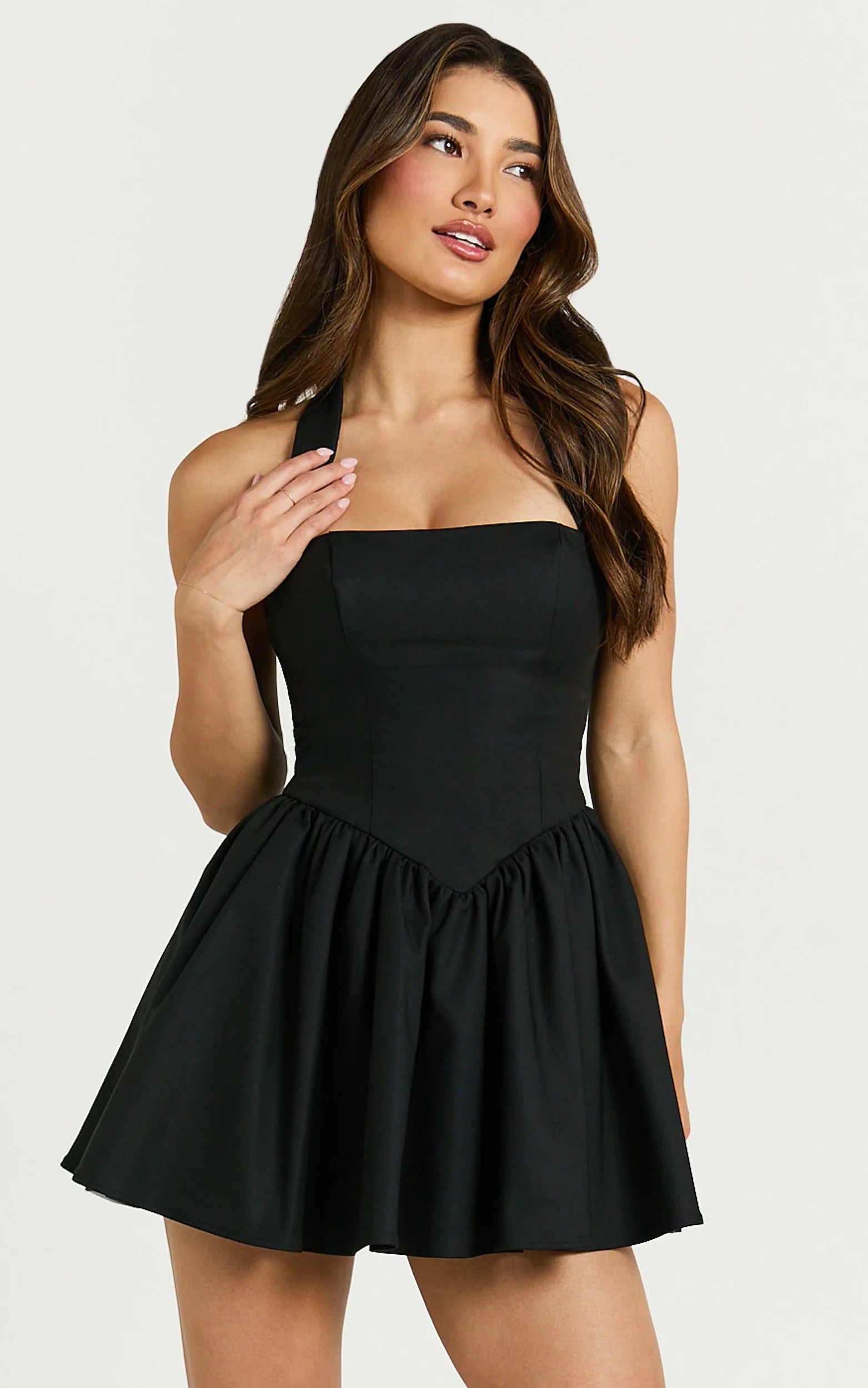 Featuring a flattering halter tie neckline and a structured corset panel that showcases your curves, this little black dress effortlessly brings runway-inspired sass into your wardrobe.