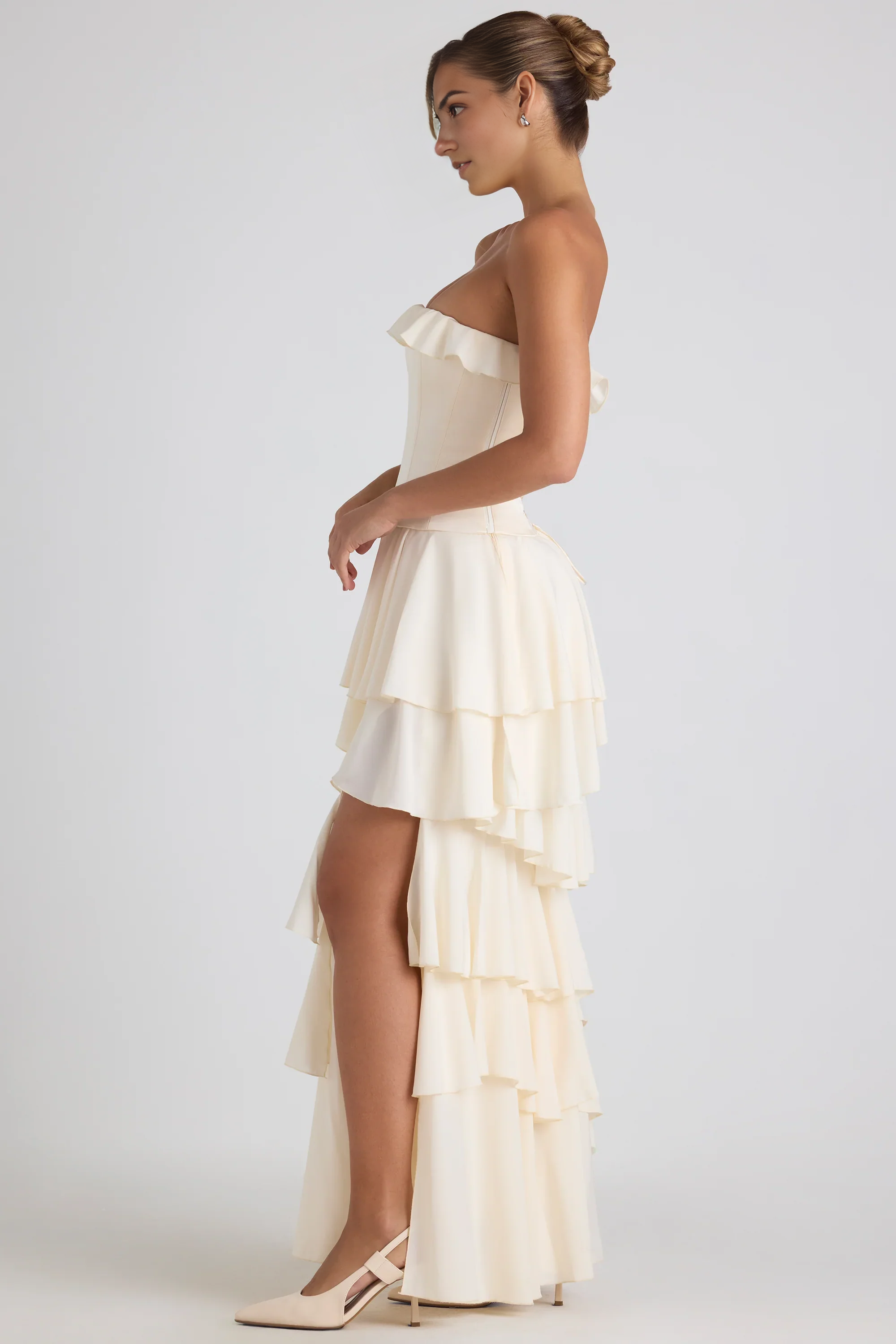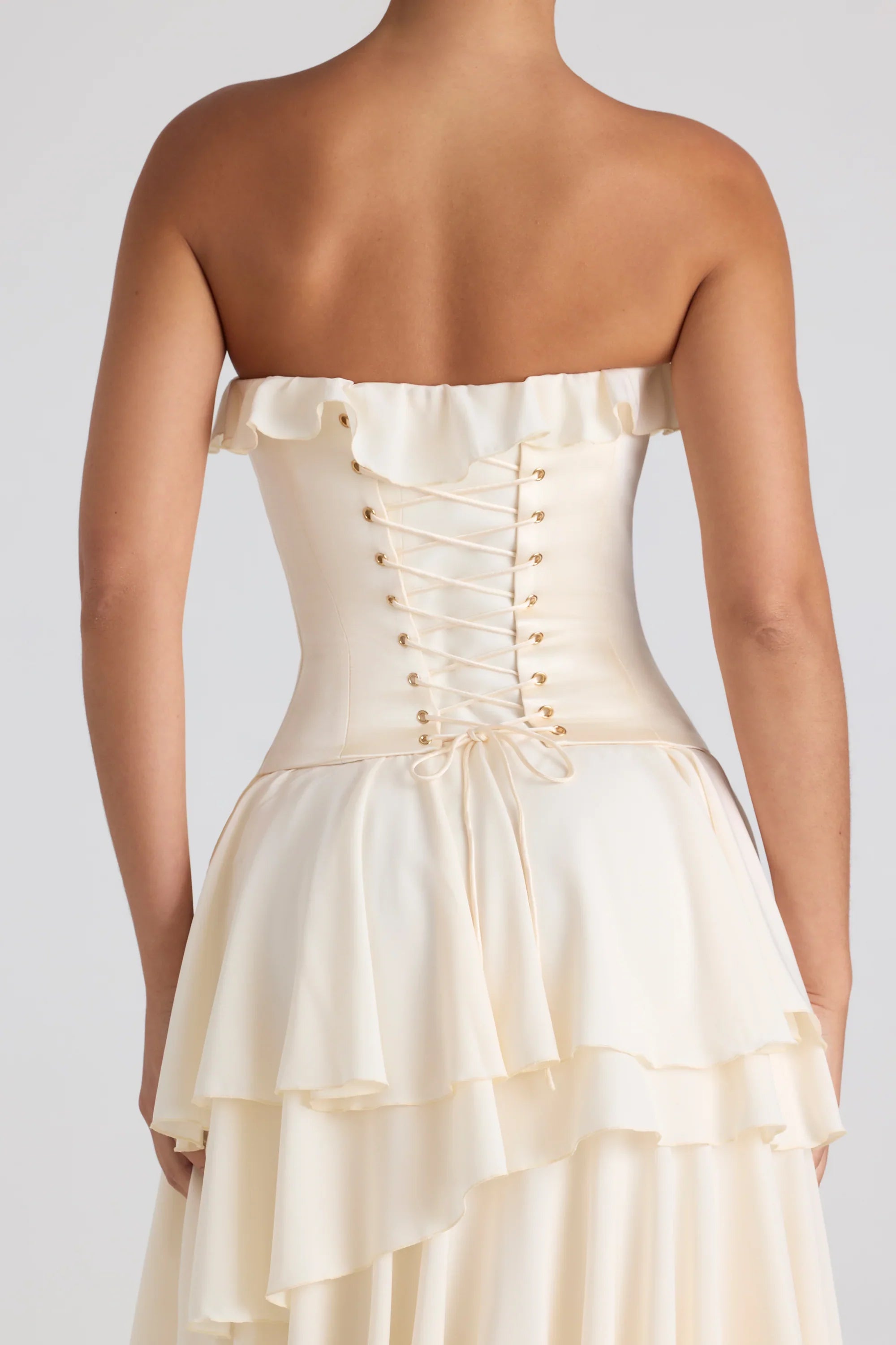 Inspired by tales of romance, the Selene Gown is a breathtaking convertible style designed for ultimate versatility. Featuring a detachable lace-up satin corset, it allows for fully customizable styling while highlighting your natural silhouette. Crafted from layers of flowing georgette, the gown showcases an asymmetric tiered skirt with a daring thigh-high split. The strapless bandeau neckline is accented with ruffle trim and internal silicone taping for secure, all-day hold.