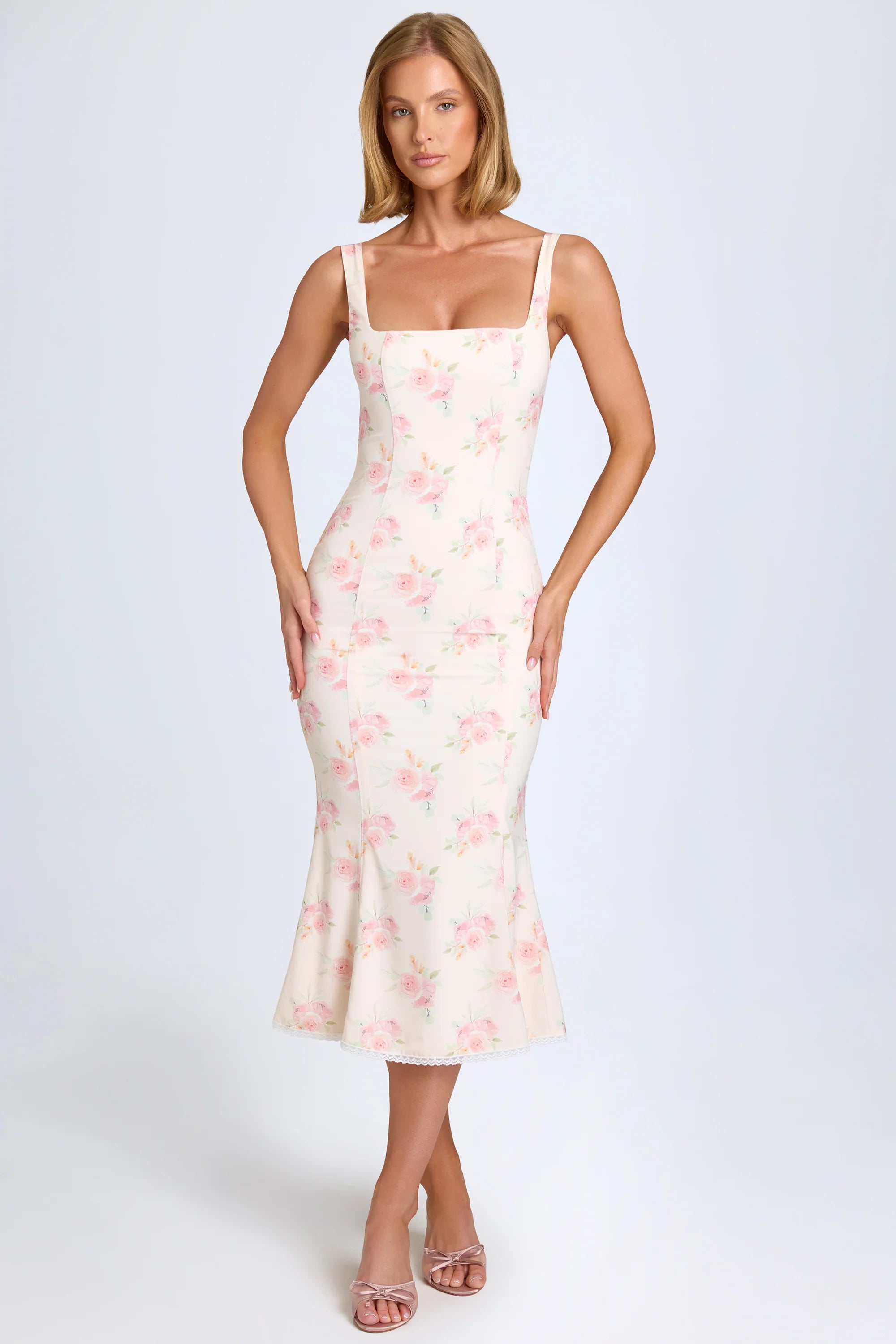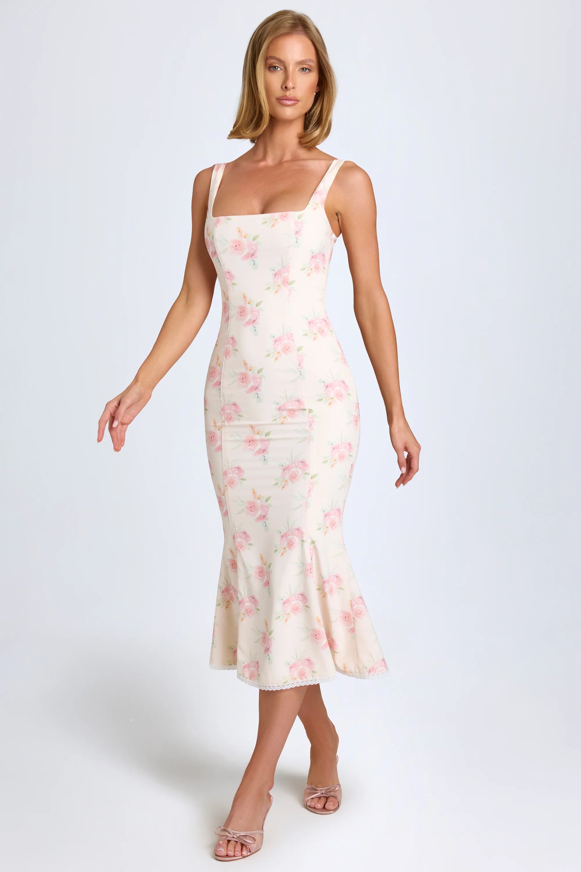 Inspired by the romance of sun-drenched days, the Petula midaxi dress is cut from premium stretch georgette to a stunning fishtail silhouette that enhances your shape. It’s elevated with contouring seams and a delicate picot lace trim at the hem, cementing the whimsical aesthetic. The clean square neckline is framed with tapered shoulder straps and adjustable straps at the back for your perfect fit.