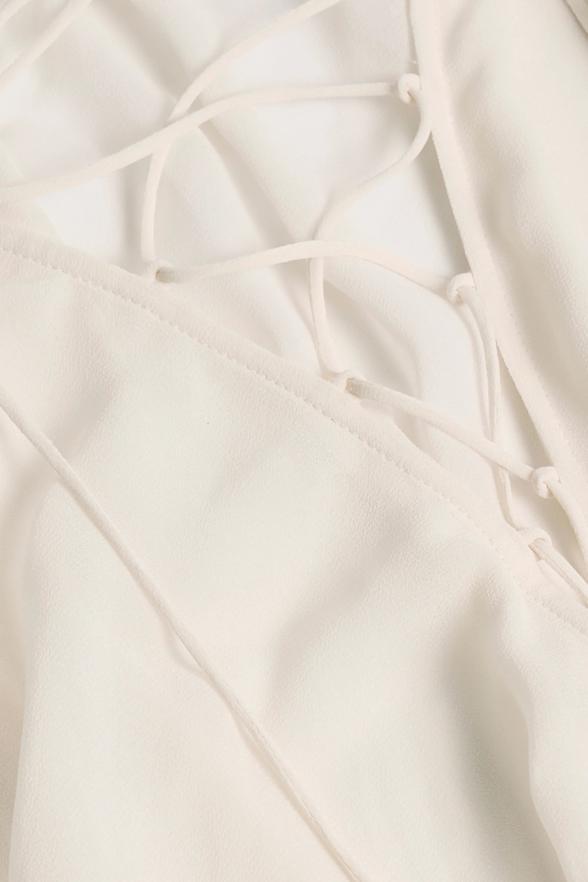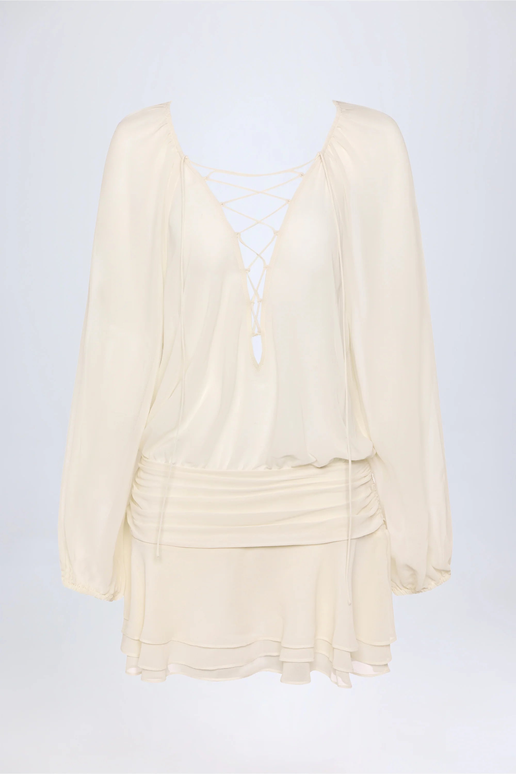 For the dreamers and all-day dancers, the Avalon mini dress is crafted from premium, lightweight georgette. It’s cut to a relaxed silhouette with a semi-sheer loose bodice, framed with oversized balloon sleeves and features a layered mini skirt. It’s complete with a plunge neckline anchored with functional lace-up ties for custom coverage.