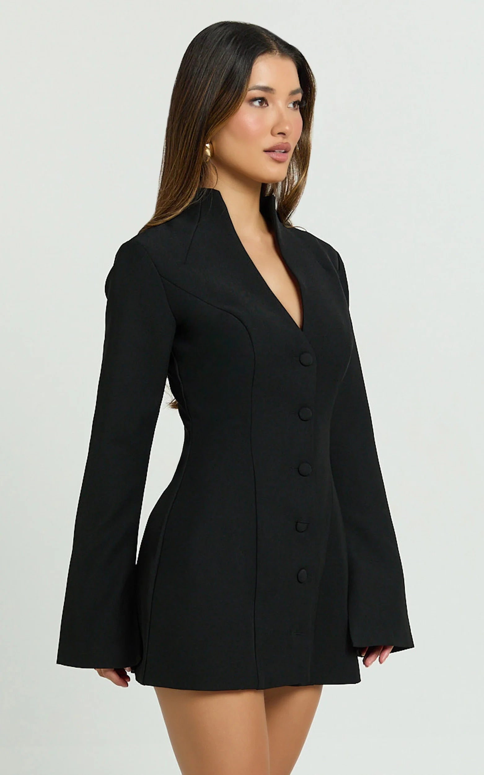 This sleek black mini features a plunging V-neckline and button-front detailing that complement your figure, while its playful tulip skirt adds just the right amount of movement, perfect for nights out or brunch dates. Inspired by the trendy dark academia aesthetic, this sophisticated dress blends polished charm with subtle allure.