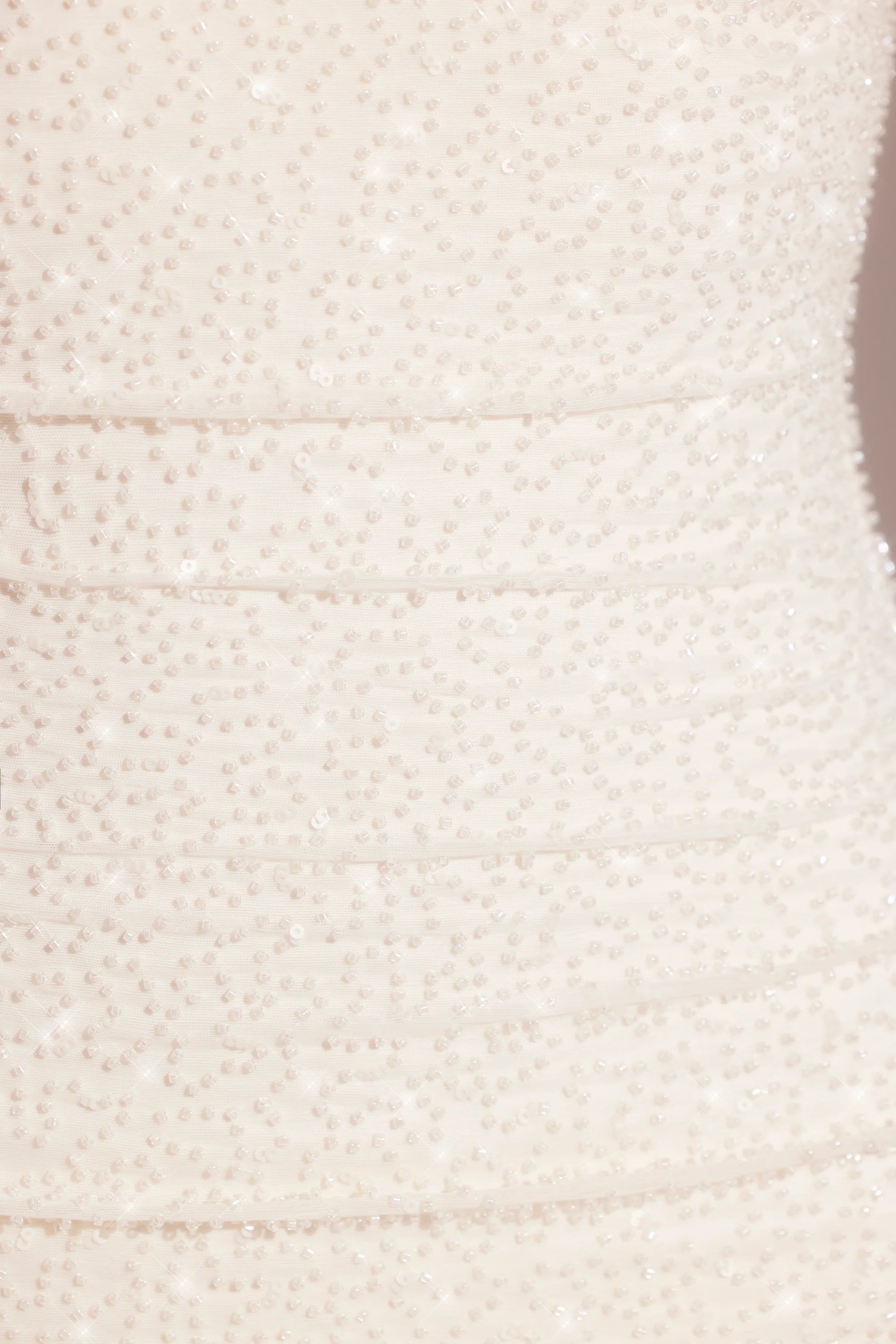 Catch the light in Ferrara. A beloved silhouette reimagined for the summer season, Ferrara is designed in our fully embellished, dual lined mesh fabric and cut to a mini length. Featuring a bust-flattering cowl neckline, ruched bodice and delicate ruffle detailing, steal the show your birthday plans and beyond.