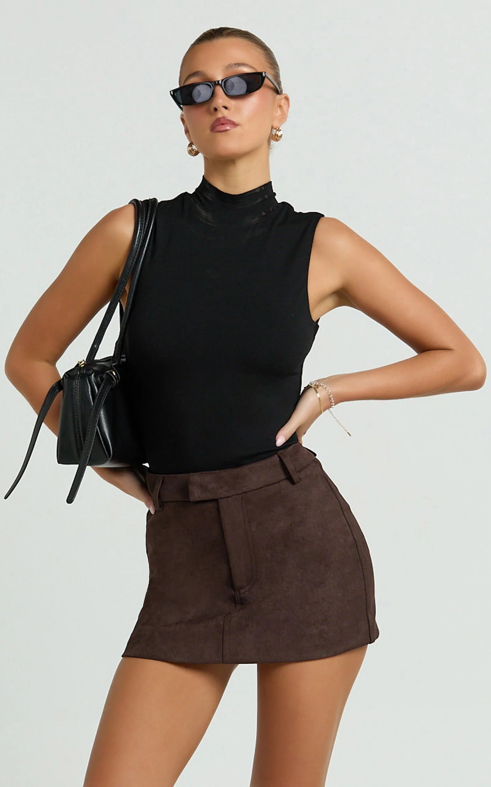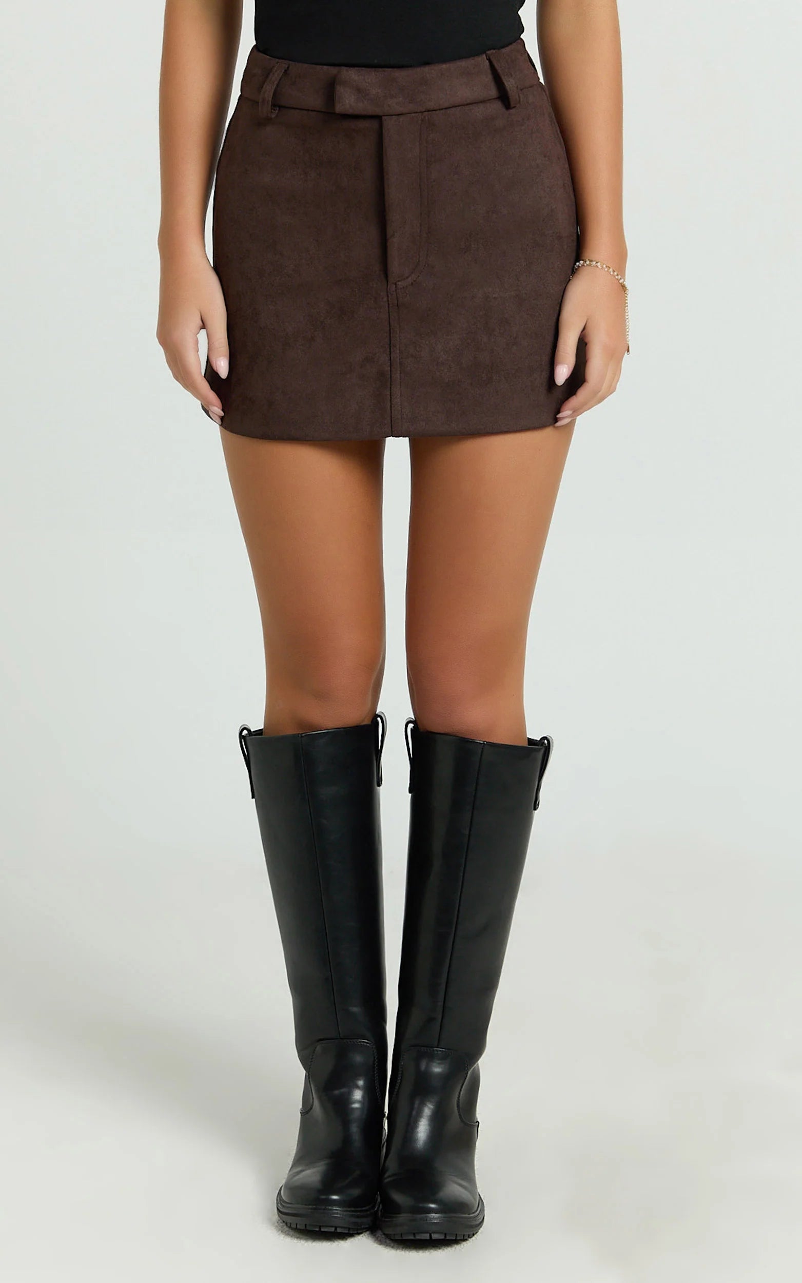 Crafted from luxurious dark chocolate faux suede and designed with an ultra-flattering mid-waist silhouette, this skirt beautifully sculpts your curves and highlights your shape. Pair it with a ballerina-inspired bodysuit or a cropped cardigan to dial up the charm even more.