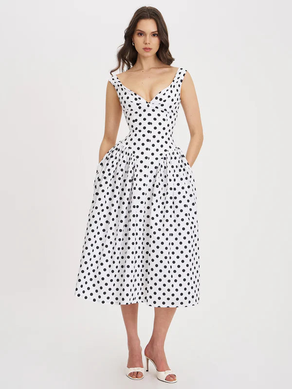 The Rahma Dress is a graceful take on everyday elegance, crafted from Eco Luxe cotton poplin with a crisp white base and playful polka dot print. Designed with a gathered breast and drop waist, it flows into a gathered midi-length skirt that moves beautifully with every step. Inside skirt support offers subtle structure, while the invisible zipper ensures a smooth fit. Perfect for spring strolls, garden parties, or warm-weather getaways.
