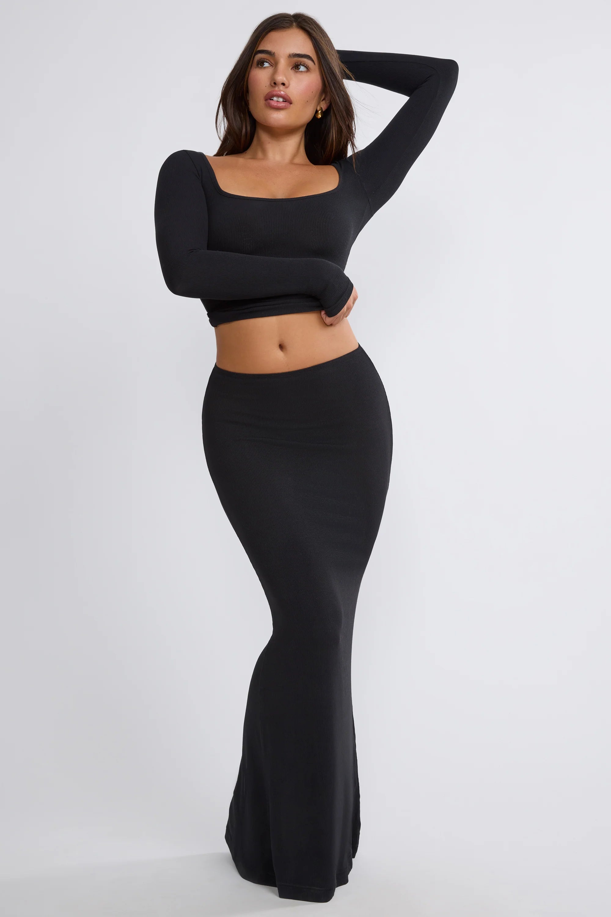 Modern minimalism. Blending style and sustainability, discover our Modal edit of elevated everyday staples and year-round wardrobe foundations. Crafted from low-impact TENCEL™ Modal fibres, the Mona maxi skirt is a classic bodycon silhouette that sits at the mid waist and combines premium quality with a commitment to the planet. Featuring unmatched softness and breathability, this ribbed design is complete with an elasticated waistband and gentle flare hem that allows for effortless ease of movement. Biodegradable and compostable, the TENCEL™ Modal fibres are sourced sustainably from beechwood trees.