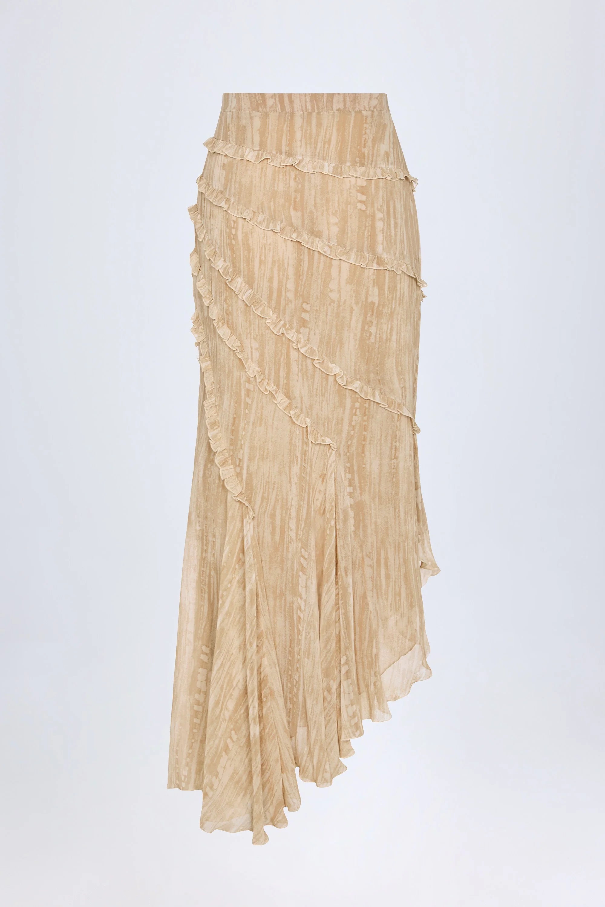 Boho spirit, elevated details. Crafted from premium, lightweight chiffon with a custom textured print, the Novina maxi skirt is cut to a breezy asymmetric silhouette traced with tonal ruffle trims for a dynamic finish. It’s designed for a universally flattering mid-rise fit for effortless styling with a cropped top or tank.