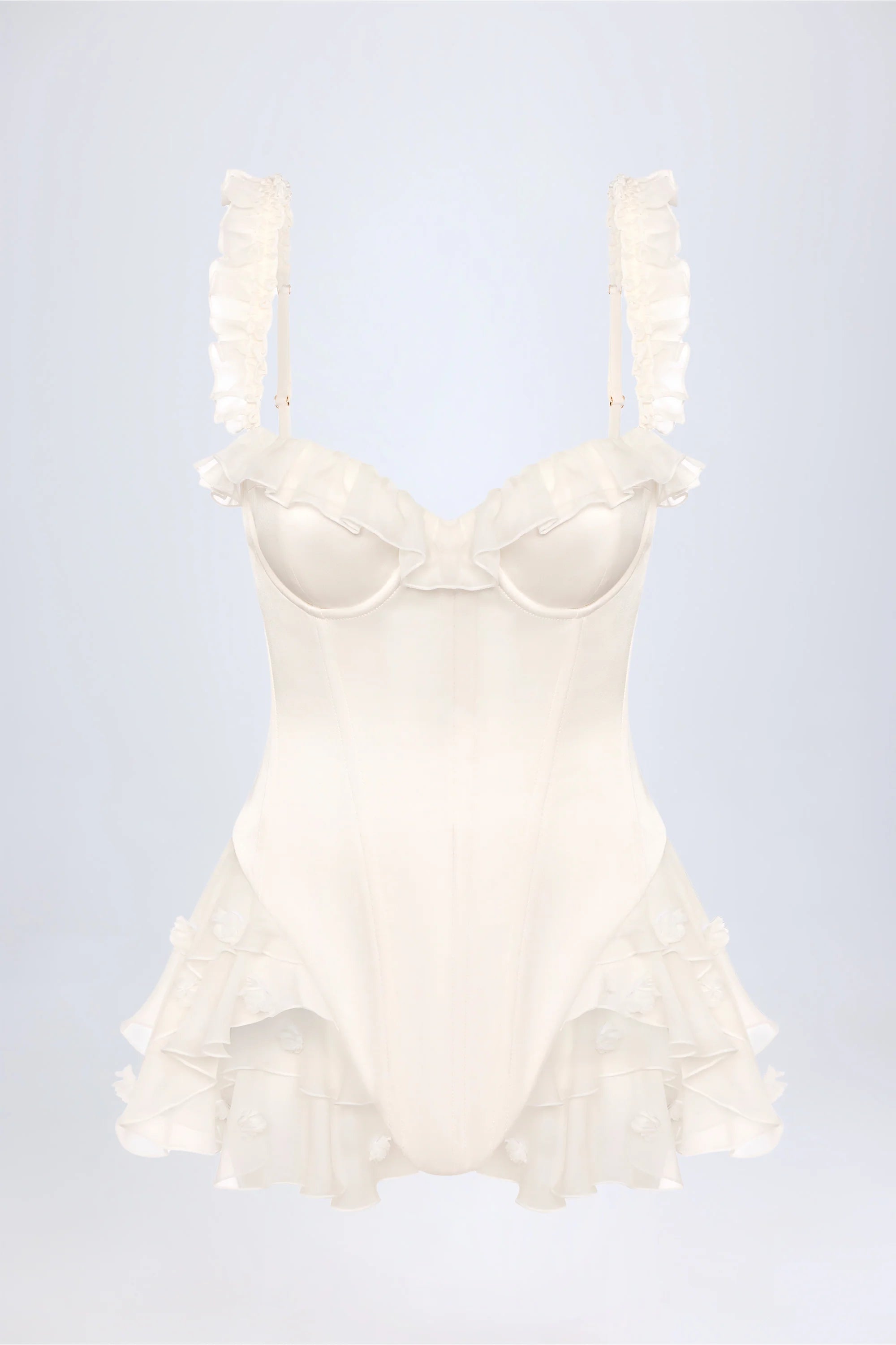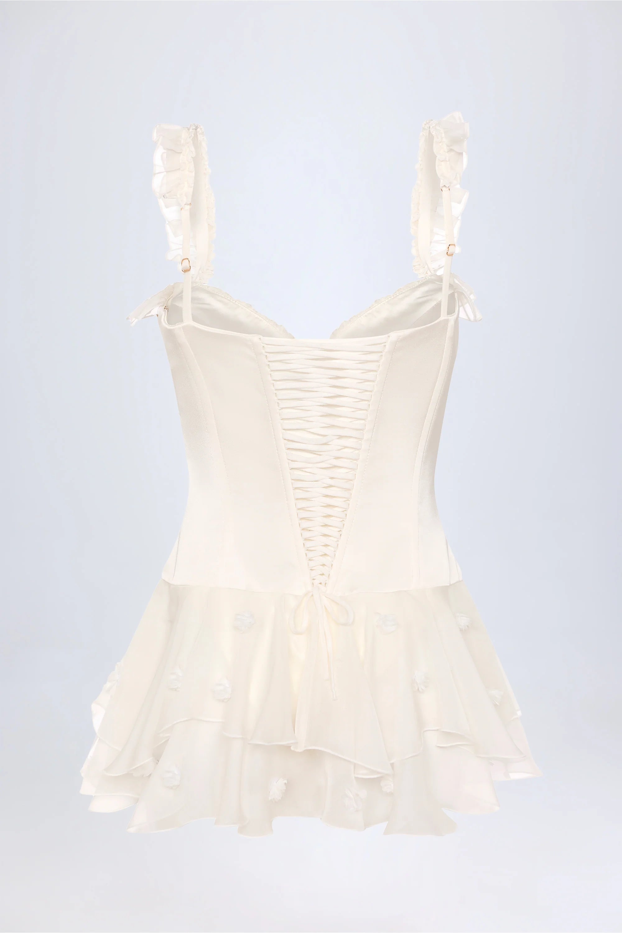 Made for the main event. A statement styling piece, the Caelie bodysuit is crafted from lightweight satin with a boned corset bodice and moulded cups for the perfect amount of support. Framed with a sweetheart neckline, ruffled trims and adjustable shoulder straps, the bodycon silhouette is elevated with a layered chiffon overlay and V-shaped lace-up detailing at the back.