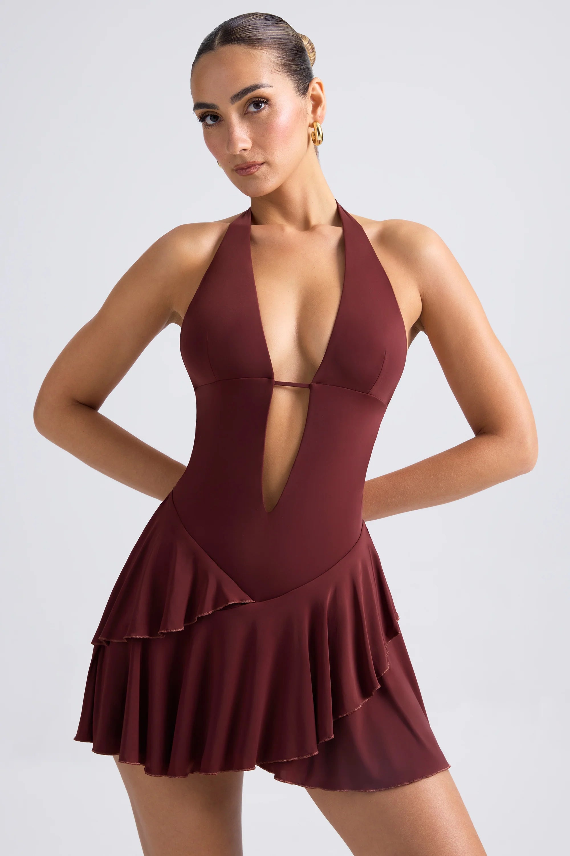 Striking silhouettes. Designed to make an impact, the Chimere mini dress is cut from our premium sheer jersey to a halterneck, A-line silhouette and enhanced with a tiered, ruffled mini skirt. It’s punctuated with cut-out detailing at the front and an open back secured with a slender adjustable strap for your perfect fit.