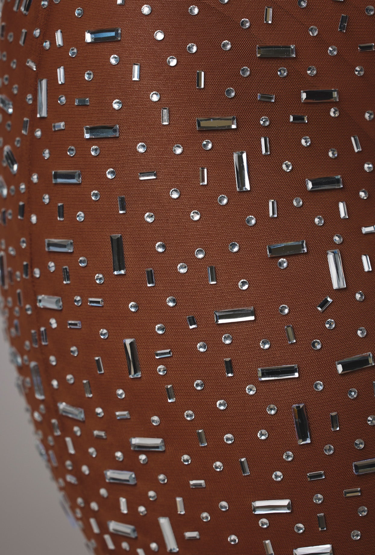Designed in our premium sheer stretch mesh and hand embellished with delicate crystal hotfix adornments, Soraya is undeniably captivating. With a high halter neckline and seductive, figure-hugging fit, Soraya is complete with a narrow back split that allows for graceful movement, wherever the evening takes you.