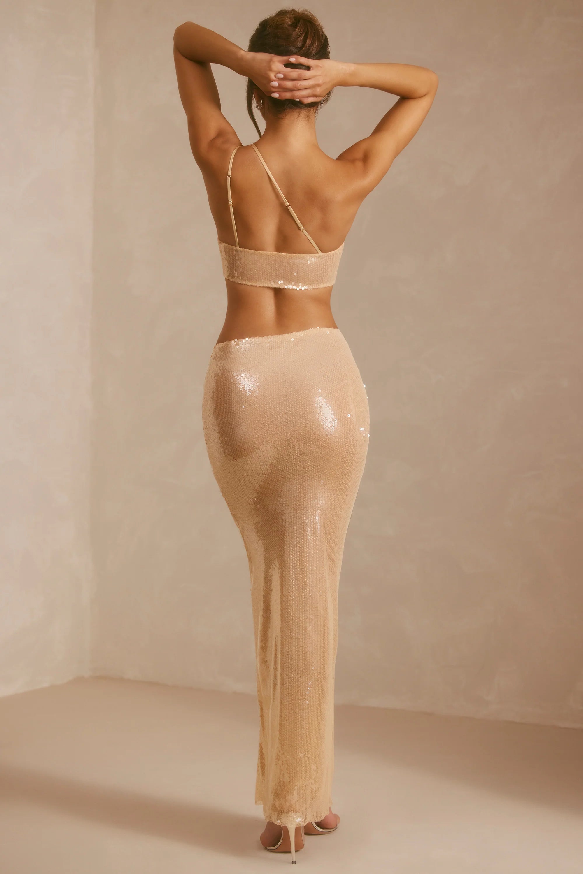 Glittering evenings with Isabel. Designed in our sequin embellished, dual lined power mesh fabric and ready to elevate your summer evening plans. The Isabel maxi dress features a sleek asymmetric neckline, statement cut-out detailing at the waist and a raw edge hem.