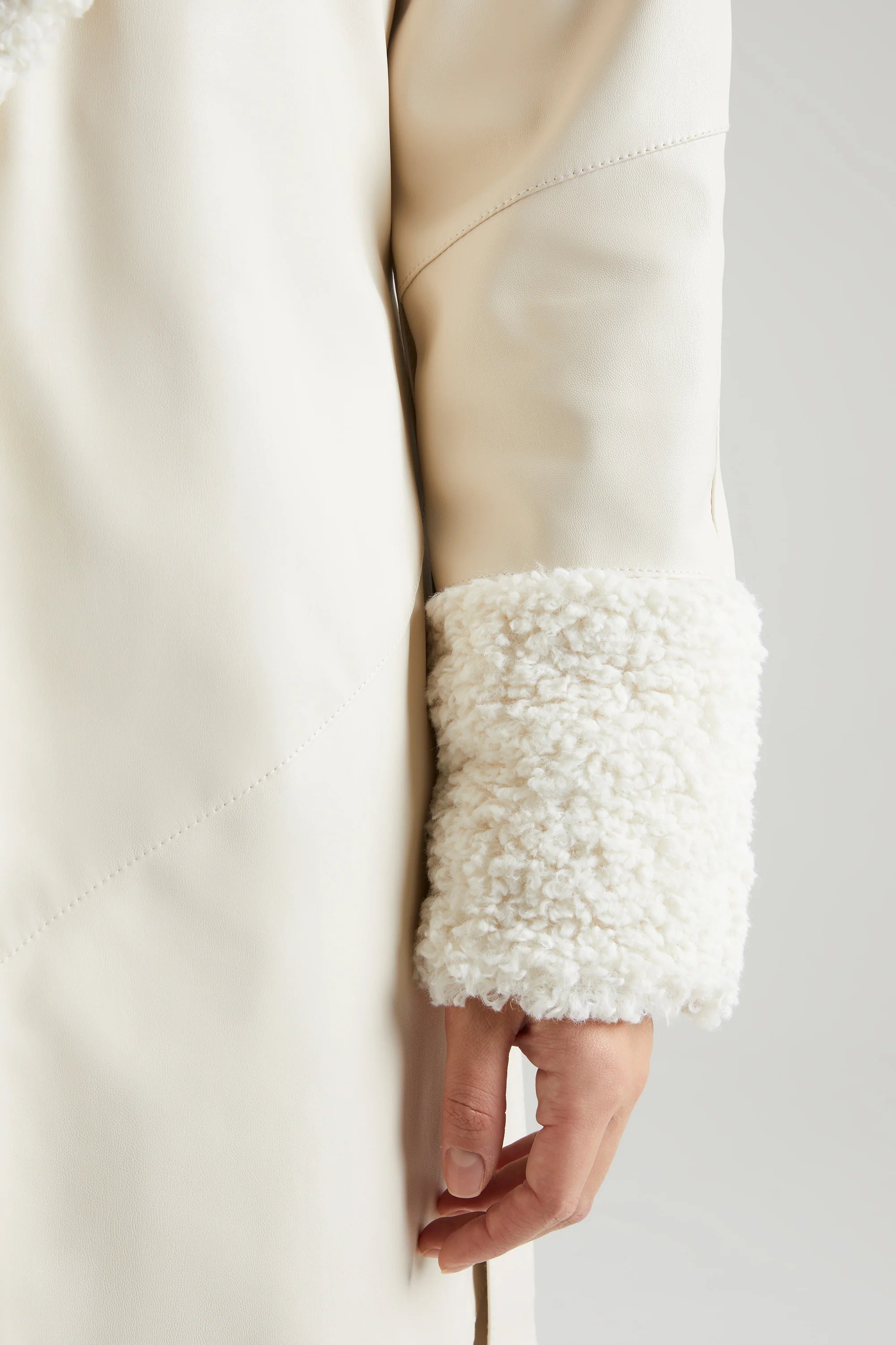 Layer accordingly. Designed in a vintage-inspired faux leather with a decadent faux borg fur collar and cuffs, Lumi is a long length coat crafted to make an entrance. Complete with a figure-flattering tie waist fastening and pocket detailing.