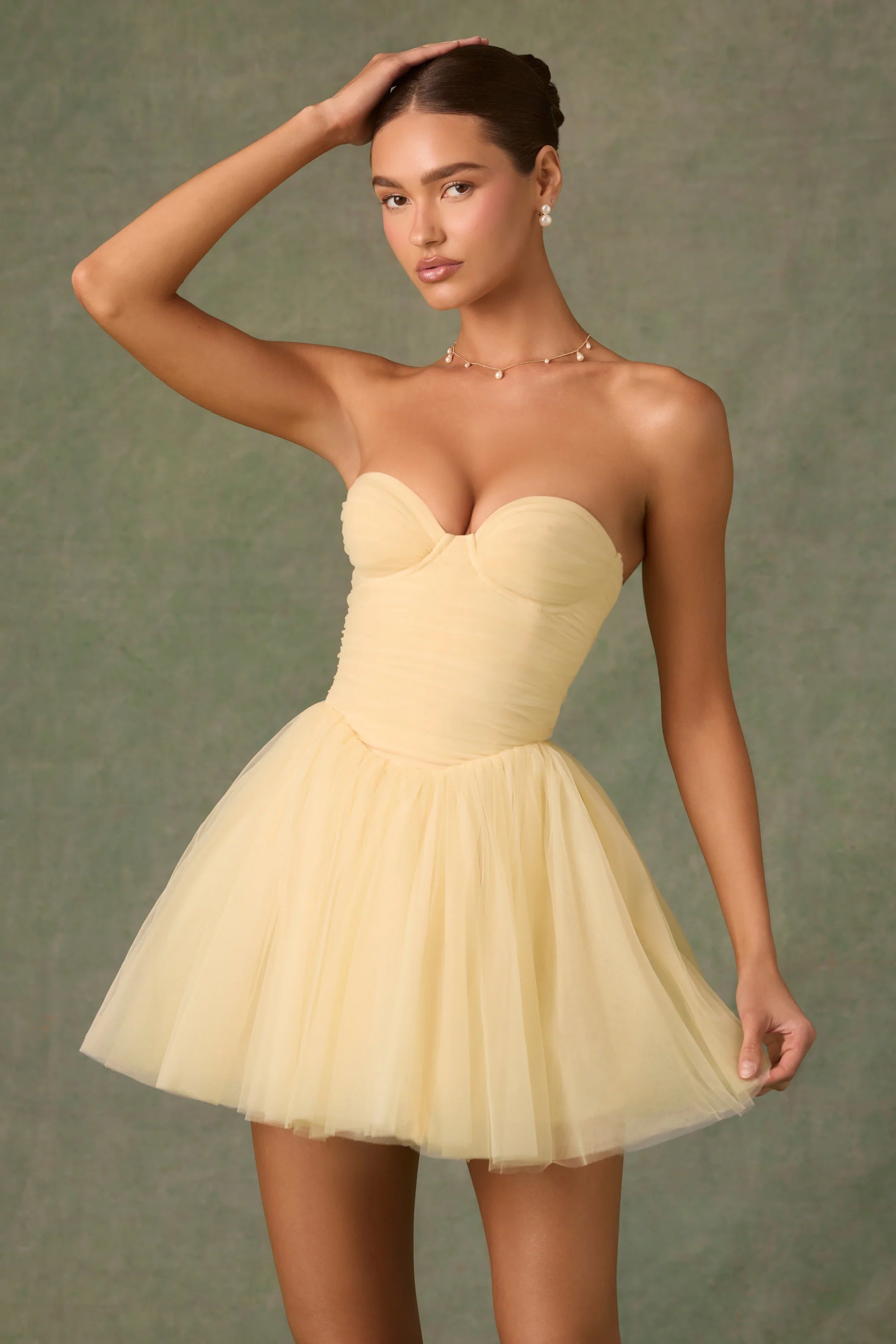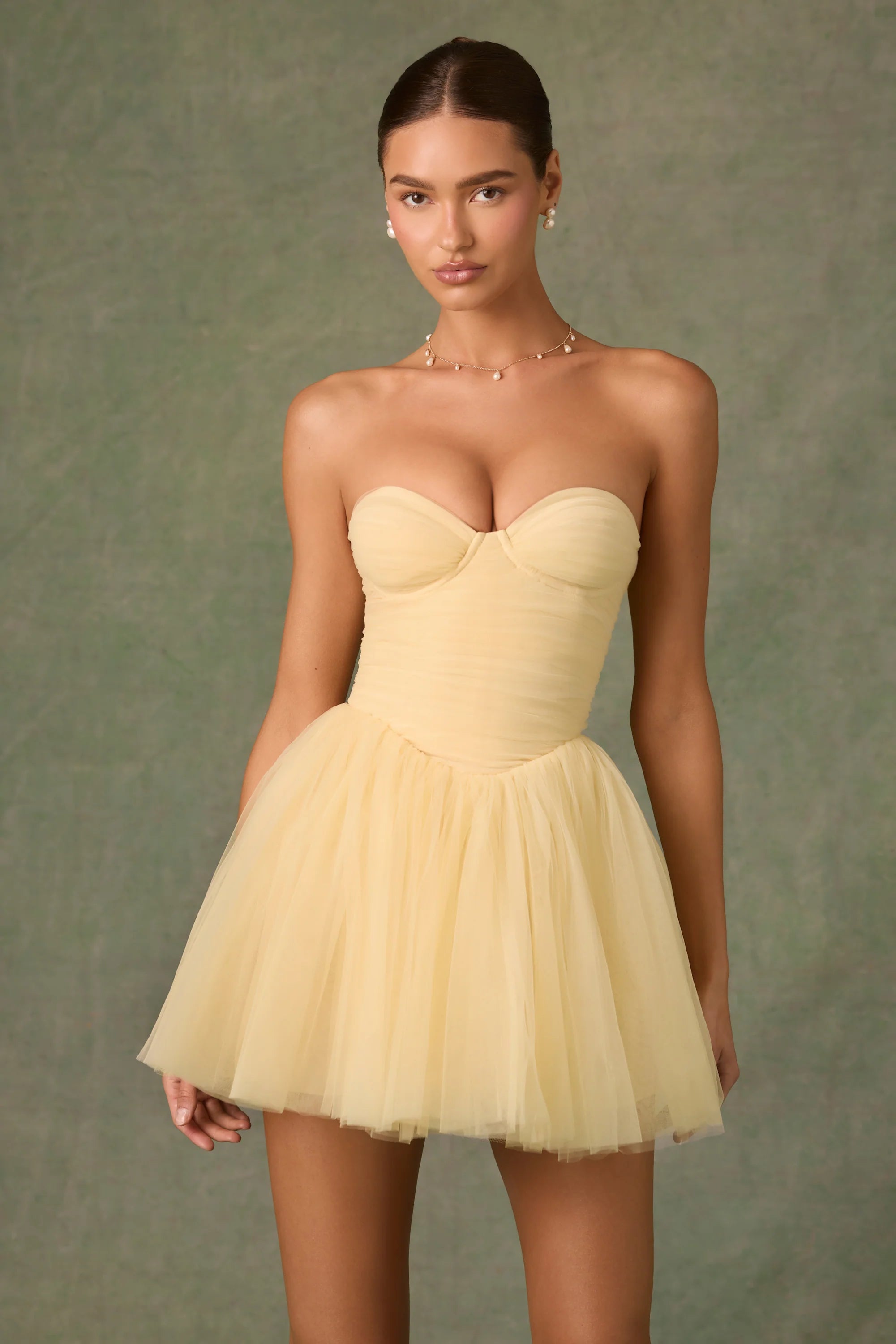 Ethereal and timeless, the Dottie mini dress is crafted from layers of frothy tulle with a fitted corset bodice complete with wired cups and detachable, adjustable straps for enhanced support. It’s enhanced with expert ruching and a V-shaped waist that creates a sculpted look before flaring to a full, voluminous layered skirt.